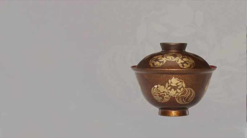 碗身為紅棕色系為底色,光影下泛著點(diǎn)點(diǎn)金光,花紋也被襯托的尤為耀眼,