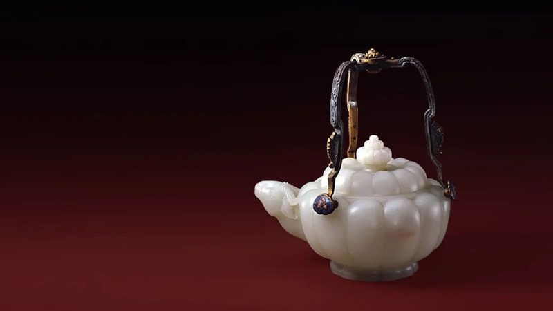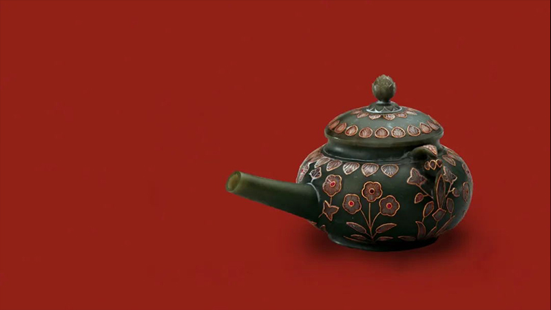 壺身花葉用金線鑲嵌,花蕊為紅色寶石,