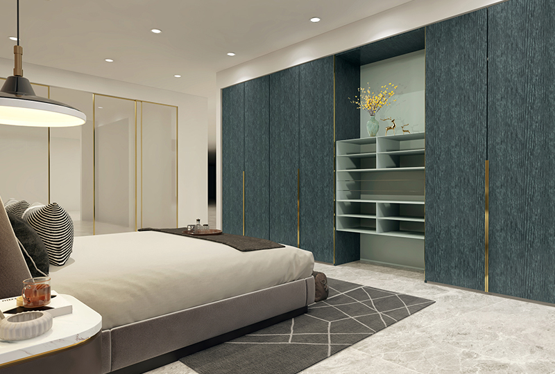 玻璃移門的金色邊框、長(zhǎng)條狀的金色拉手,