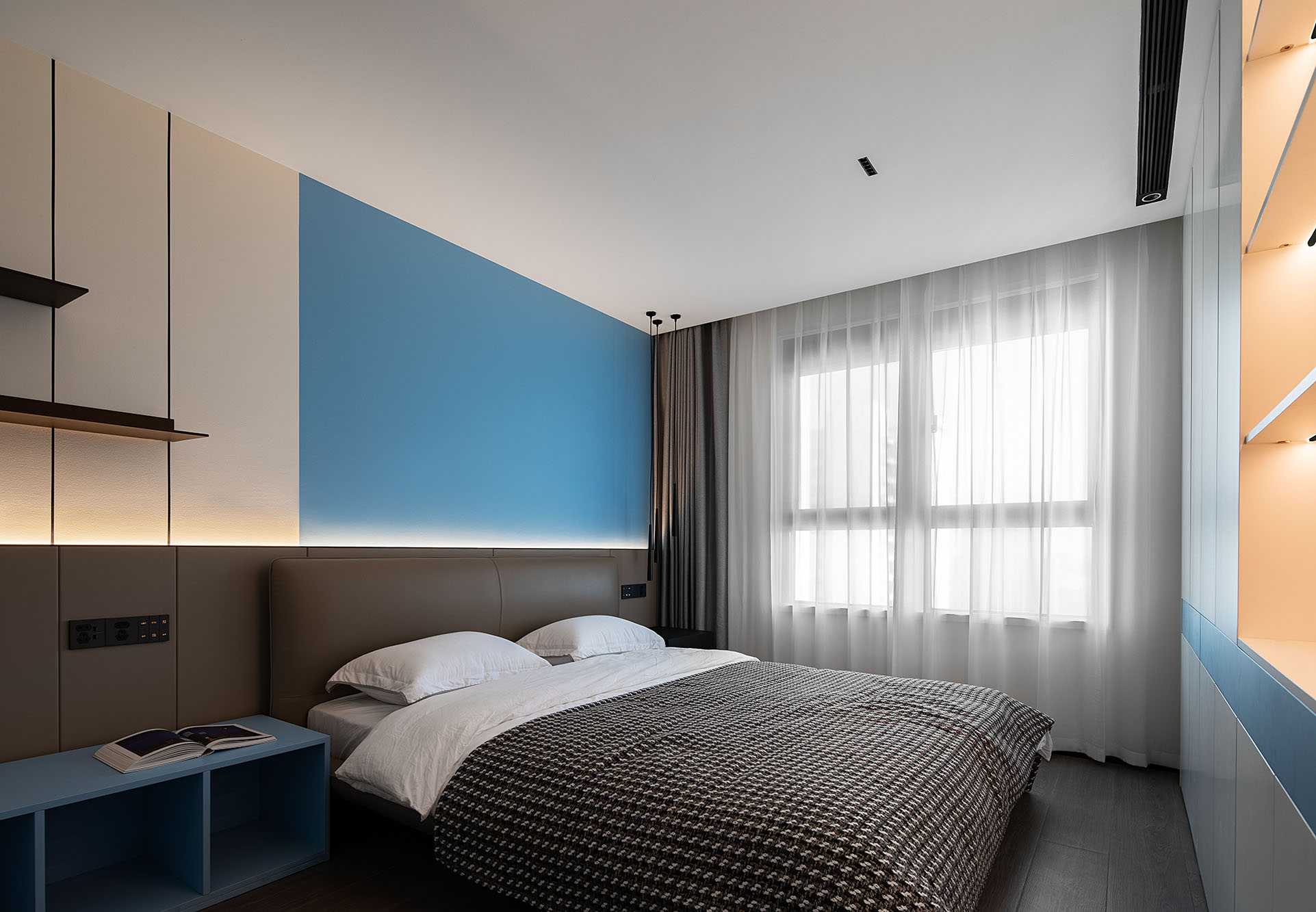 沒有過度的裝飾,只清爽的白色衣柜、純凈的藍色壁掛式書柜、墻面的鋁層板裝飾,