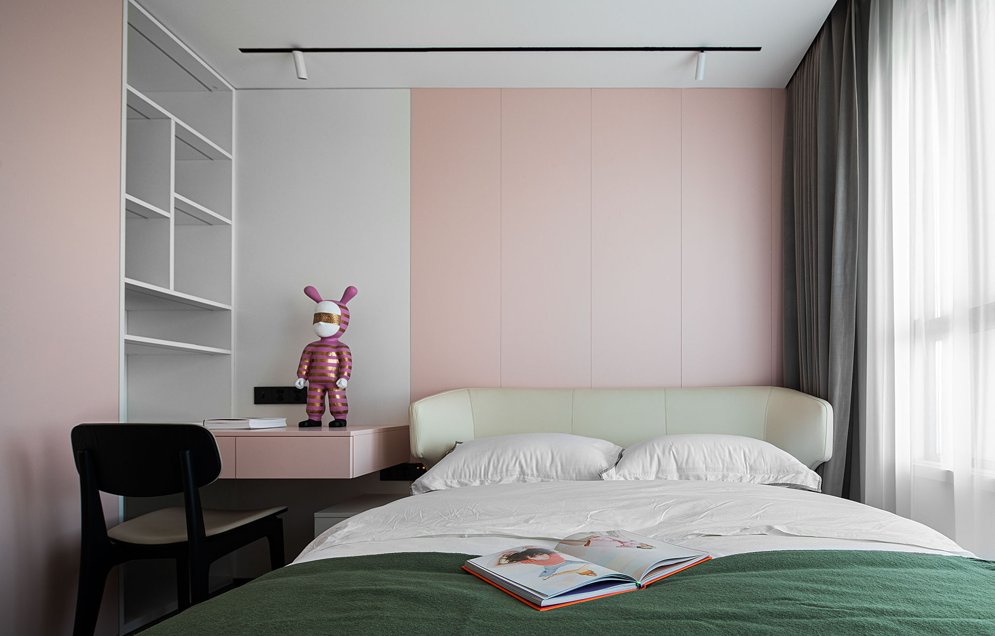 粉色的背景墻和衣柜巧妙的進行延伸,保留空間整體性,