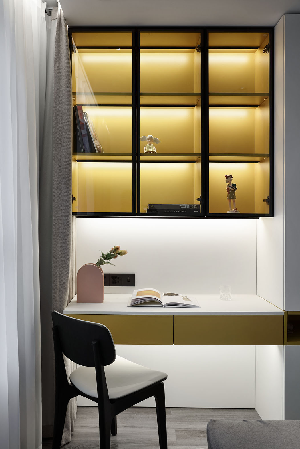 沒(méi)有過(guò)度的裝飾,只清爽的白色衣柜、活潑的黃色壁掛式書(shū)柜、墻面的鋁層板裝飾,