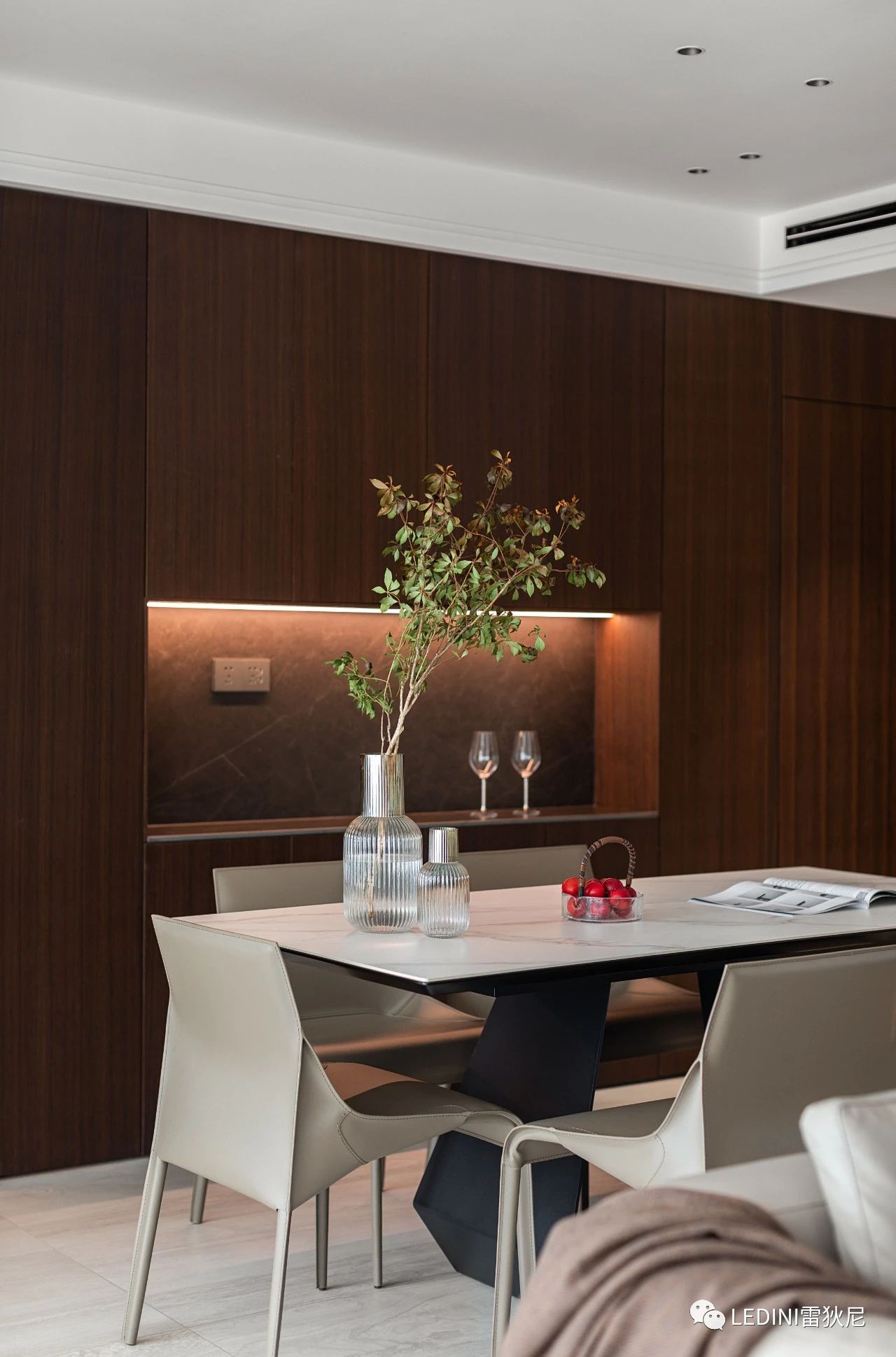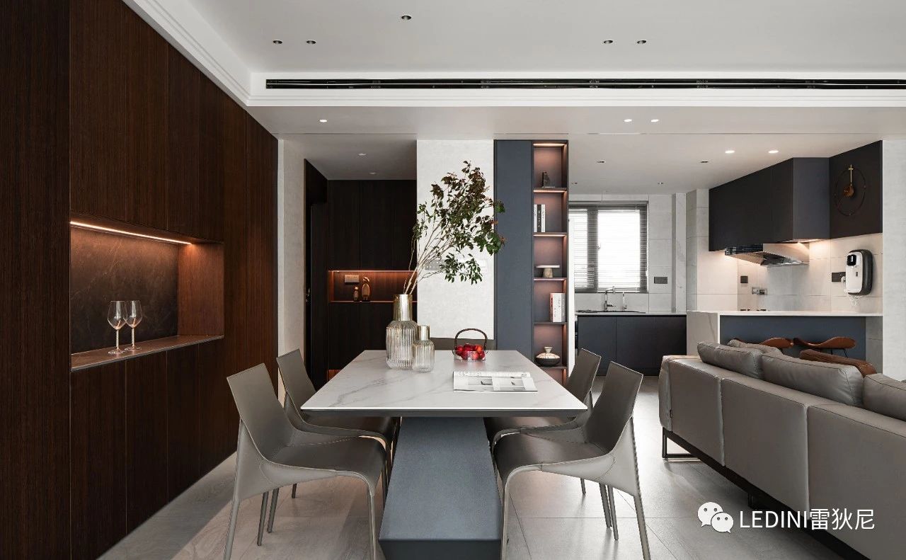 一條光線溫潤了深色的空間,提升餐邊柜層次感,