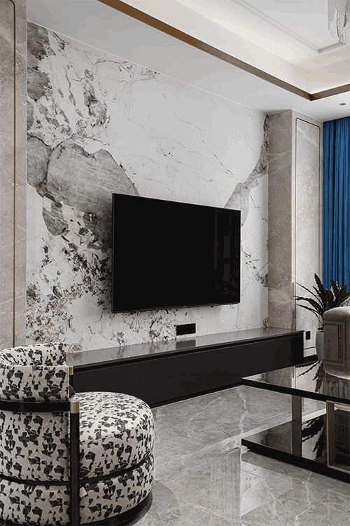 灰白色大理石電視背景墻與黑色電視柜形成了強烈的視覺對比,