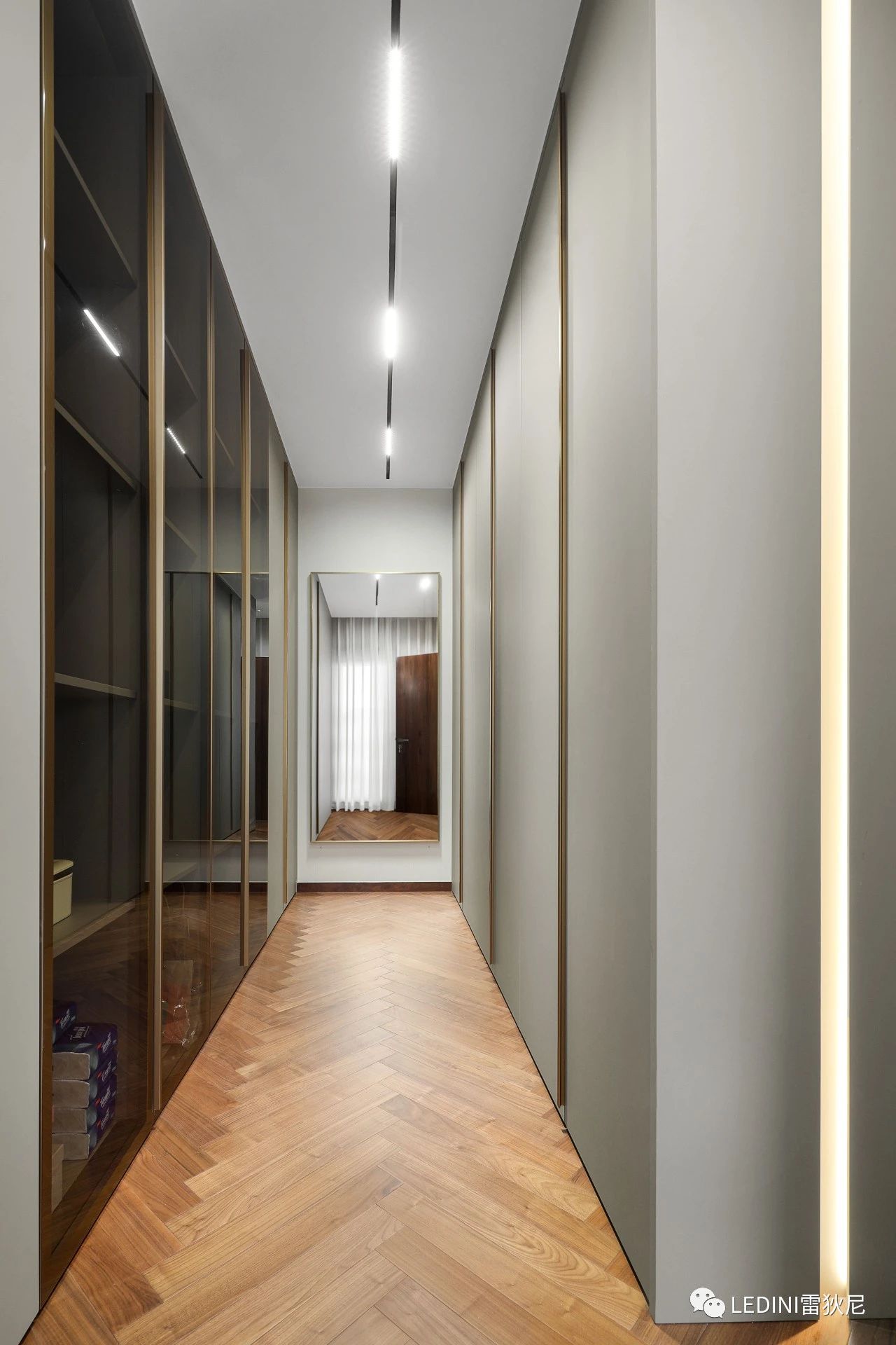 金屬邊框玻璃柜極簡的線條讓衣帽間秩序與美感并存,