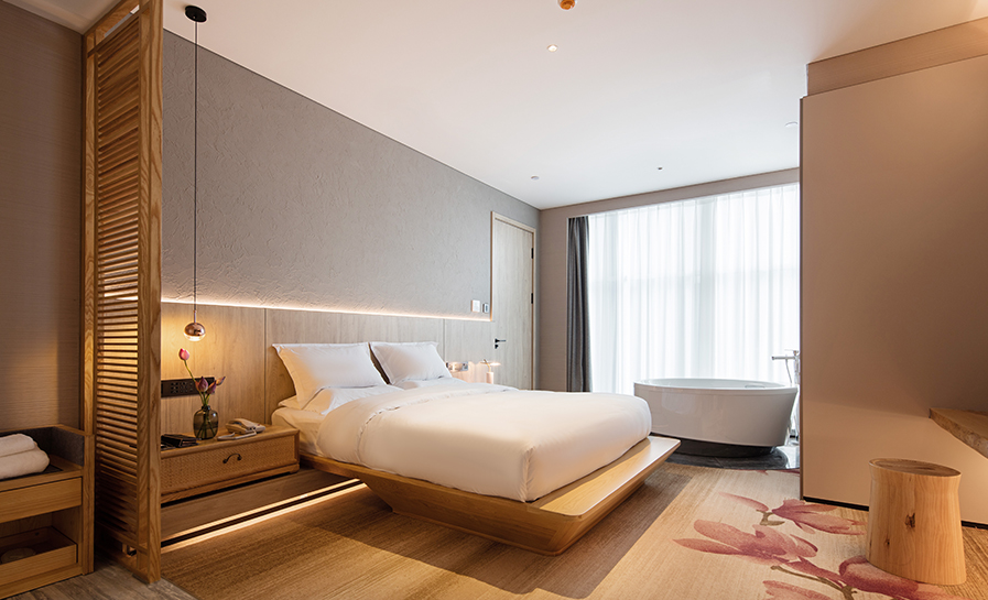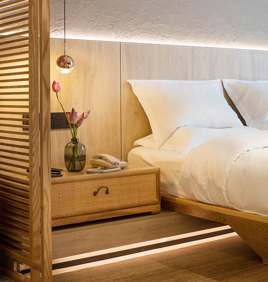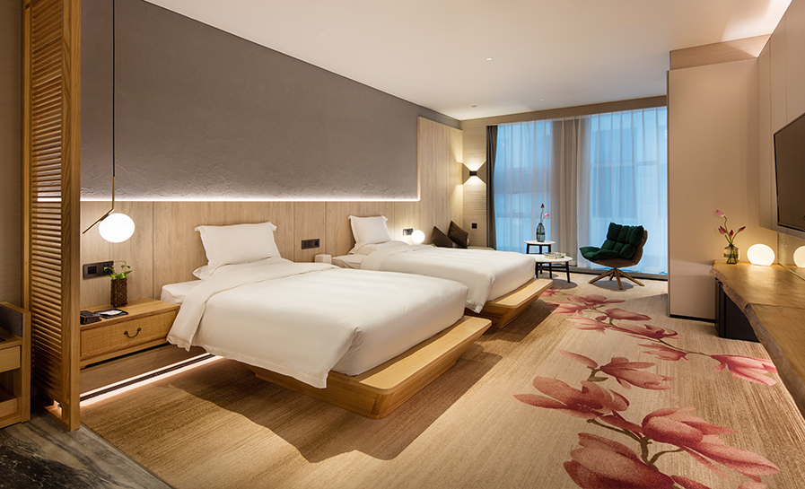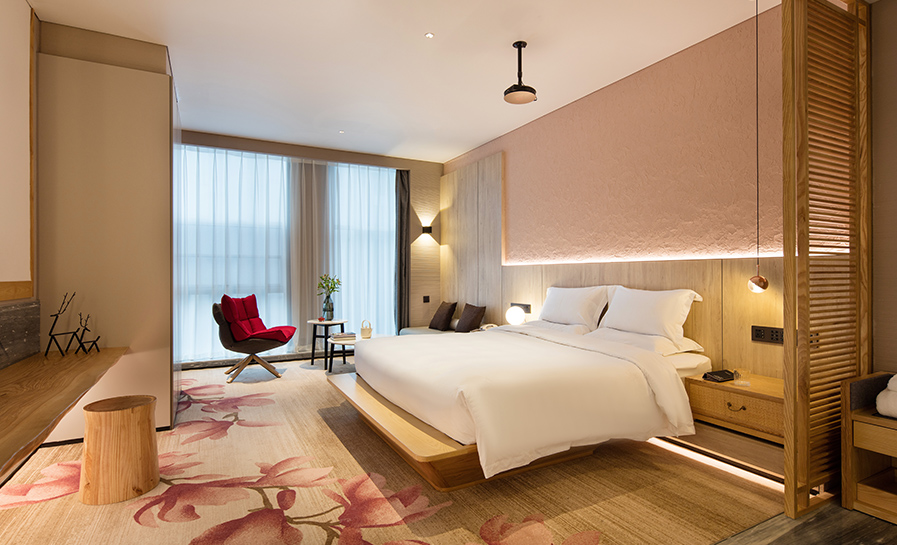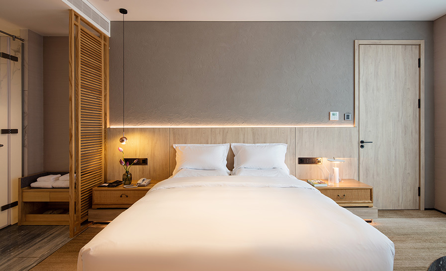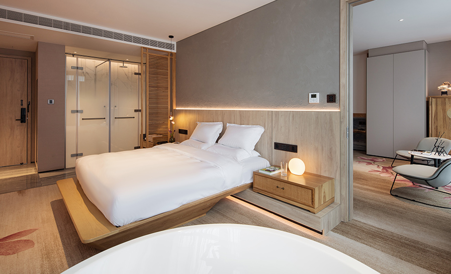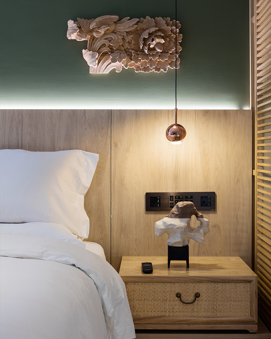 推開房門,木棉花依然盛放著。環顧四周只覺安穩靜謐,木色護墻與地毯相互映襯,將整個空間更好的融合。隔斷的運用在不破壞空間整體感的情況下將臥室與浴室巧妙的區分開來,讓房間更有空間感,縱深感。