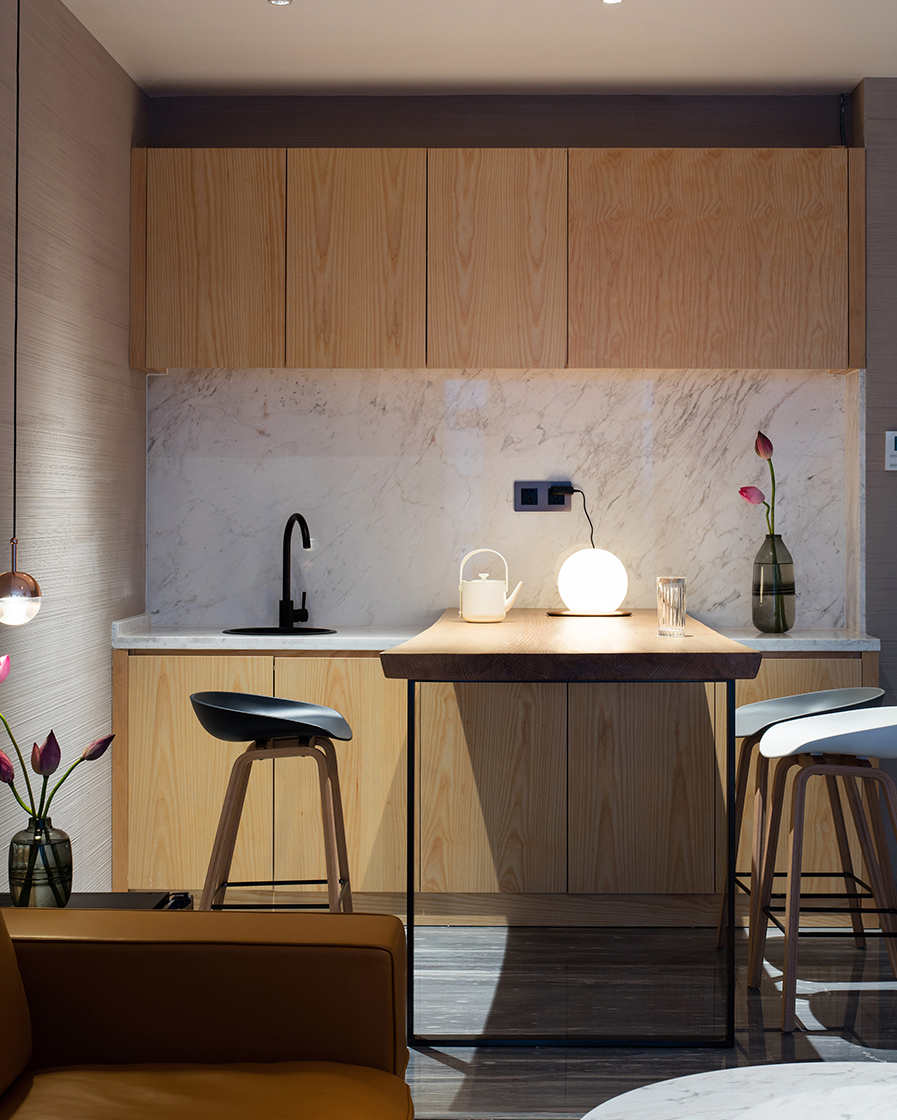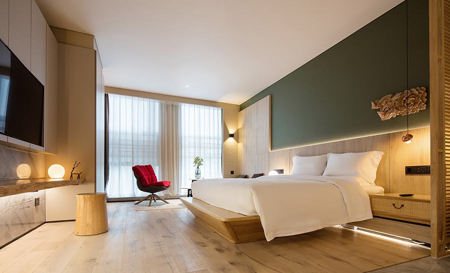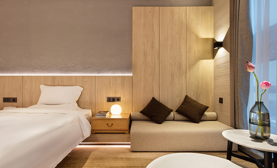 木質家具更顯質感,柔和的燈光營造溫馨,在這一方陌生的空間里,卻有如家一般的安全感。