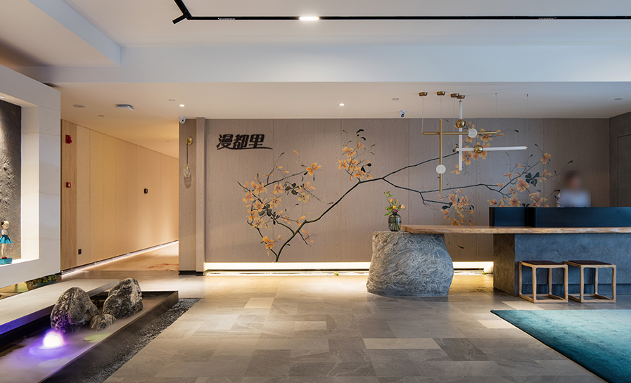 步入漫都里酒店大堂,頃刻映入眼簾的便是一樹木棉花在護墻上熱情綻放著。木色山紋護墻清新素雅,襯出色彩濃烈的木棉花,遠觀整體猶如一幅油畫,而護墻就是那一張能供設計師盡情揮灑的優質畫卷。