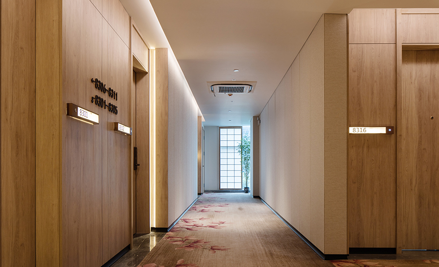 盛開的木棉花一直蔓延至走廊,腳下柔軟的地毯,身邊兩側原木護墻,在柔和的燈光下更顯寧靜舒適,仿佛置身于自然。