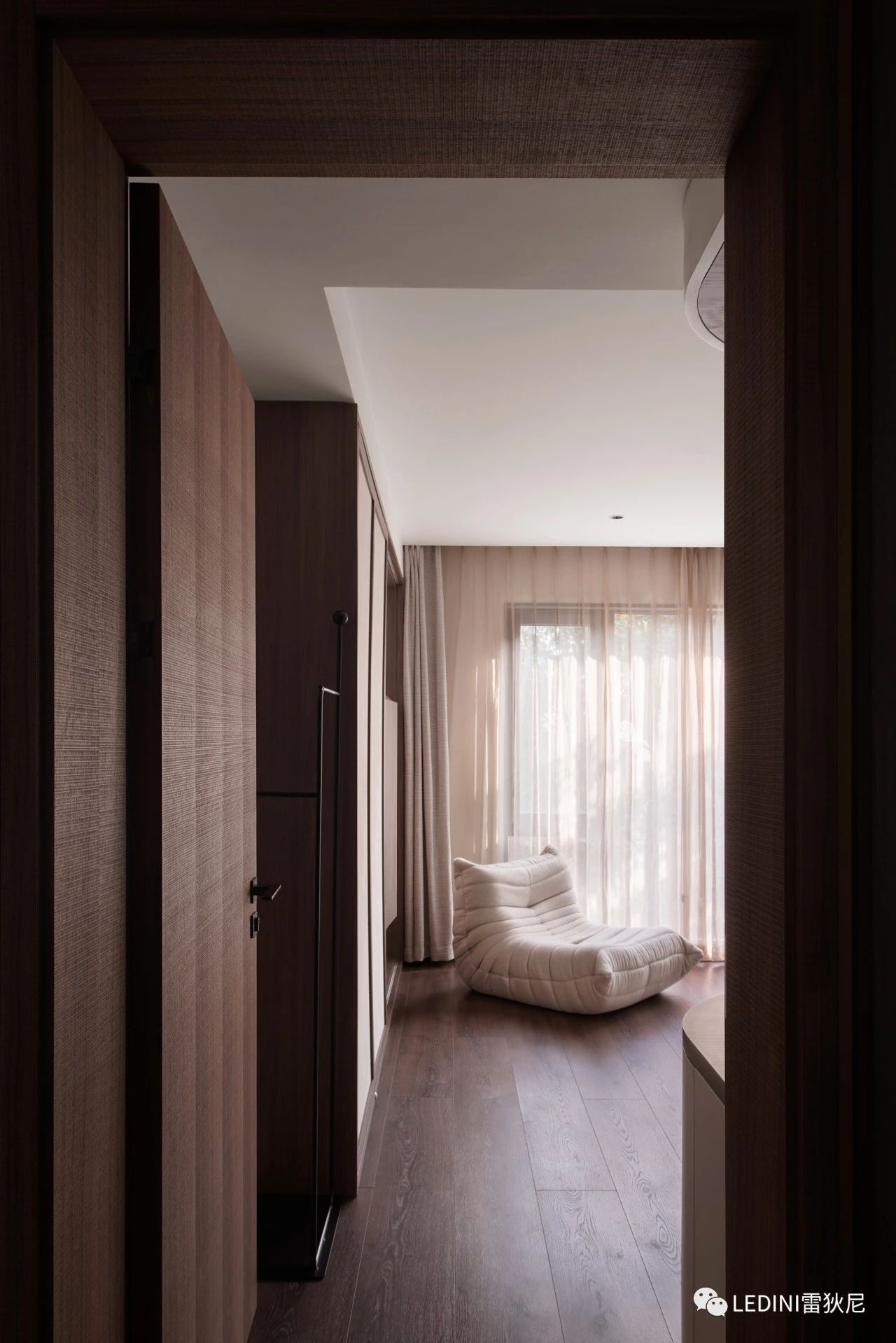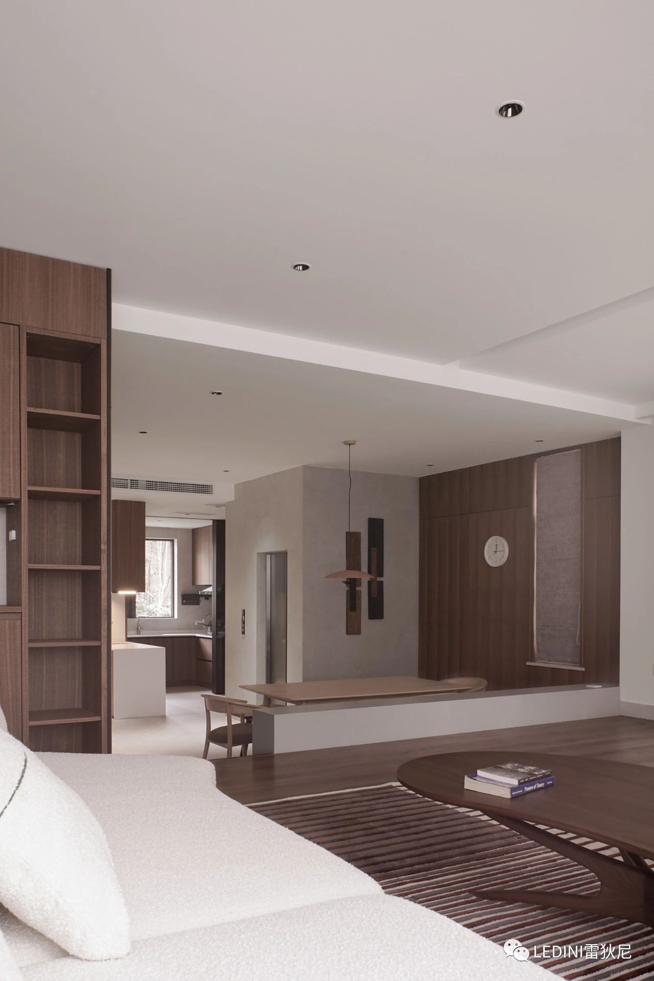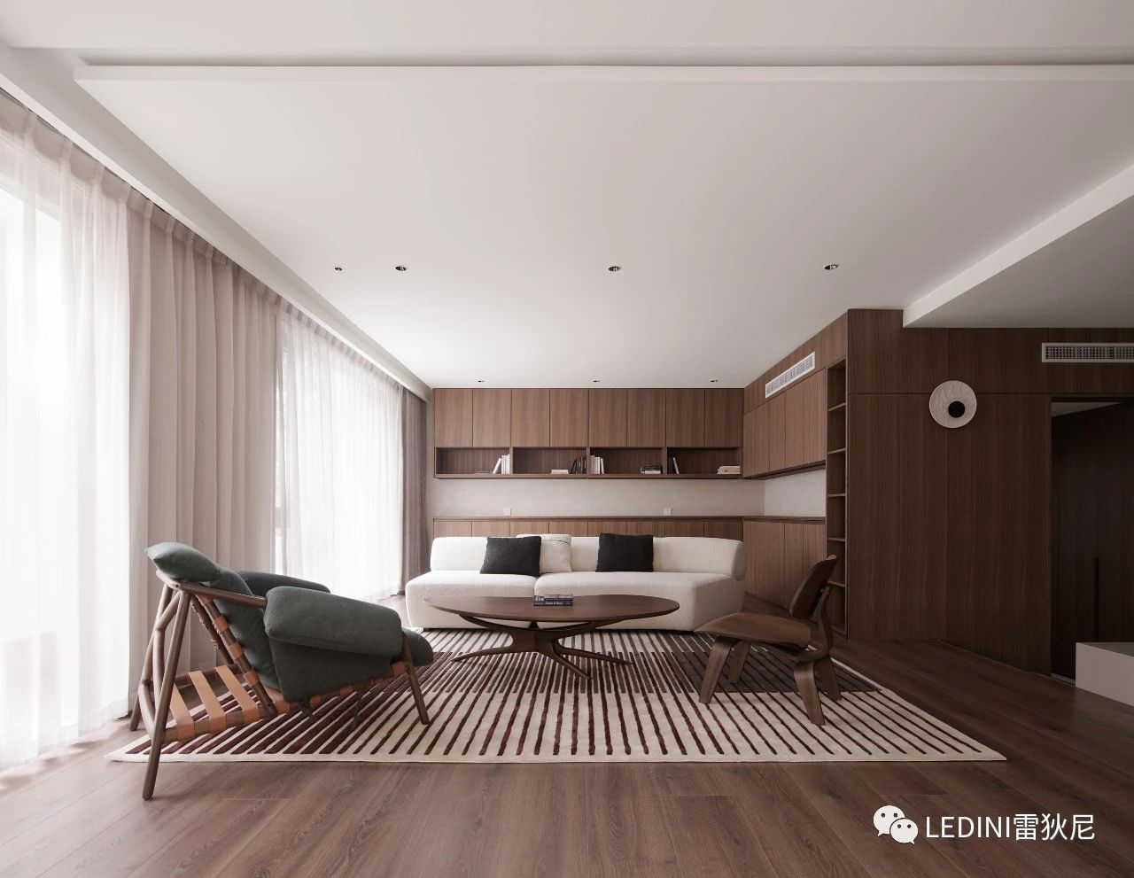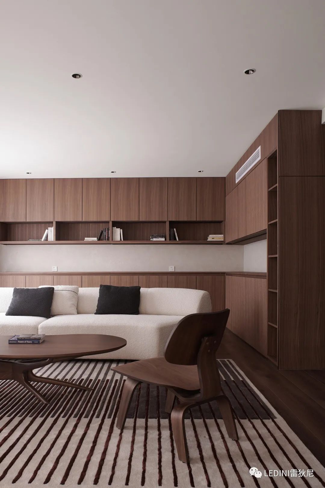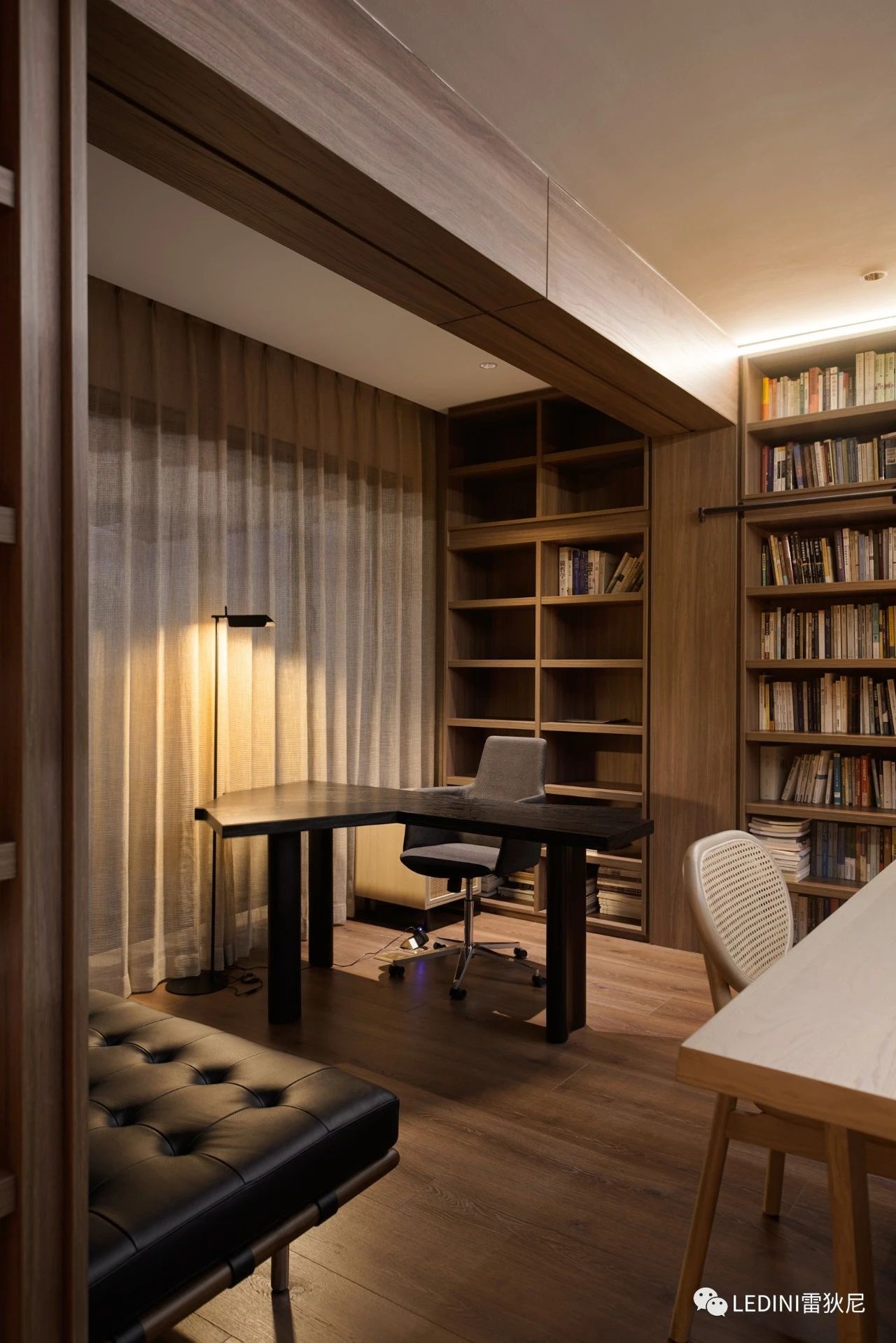 于是選用了LEDINI胡桃木鋸齒紋為全屋主要材料,相較于傳統板材,