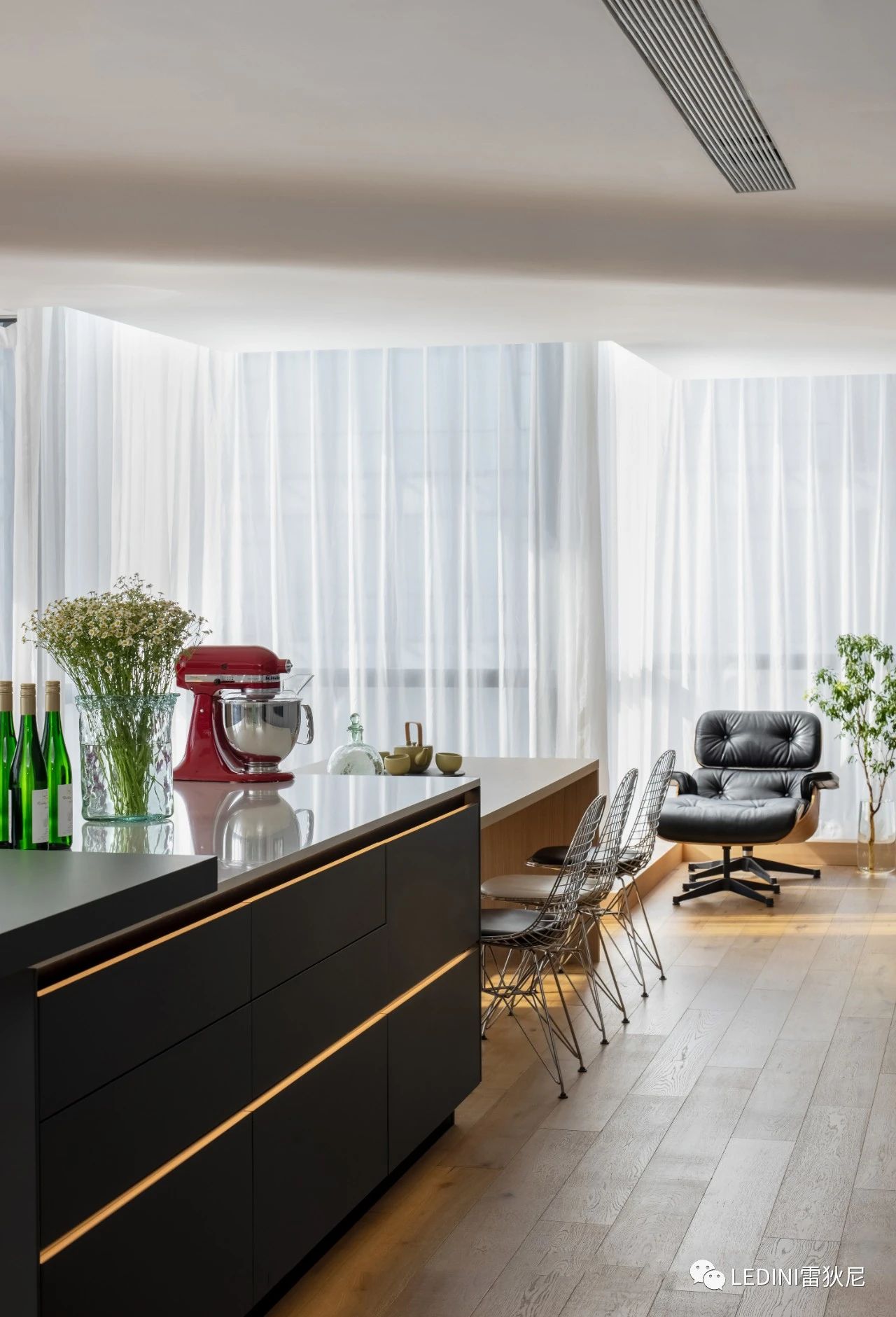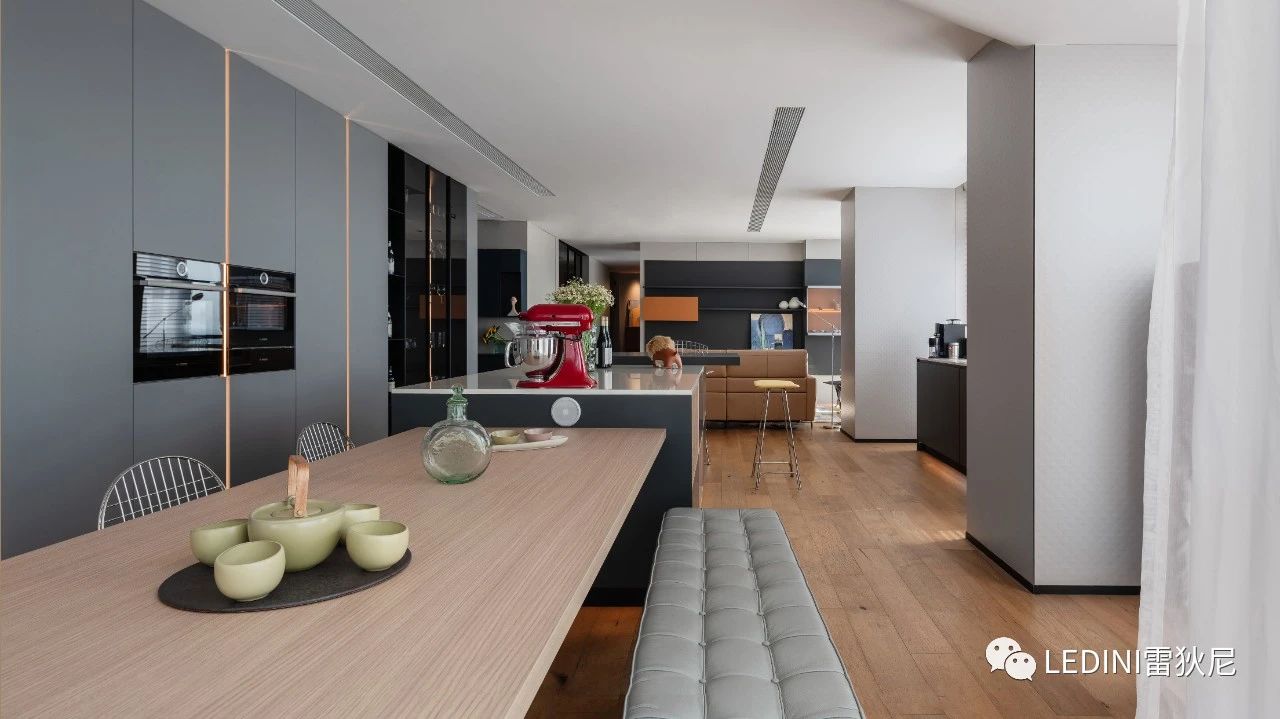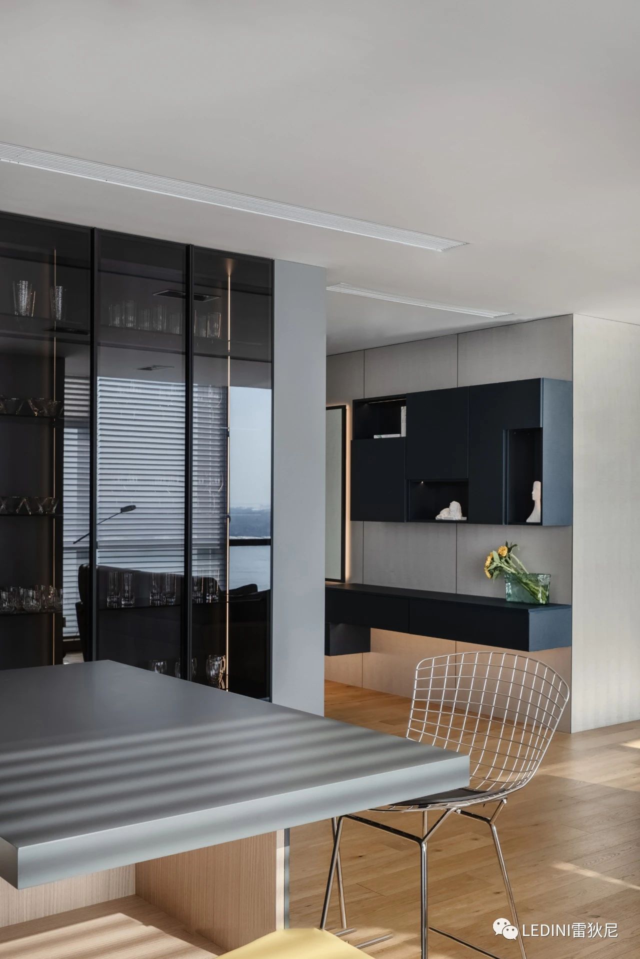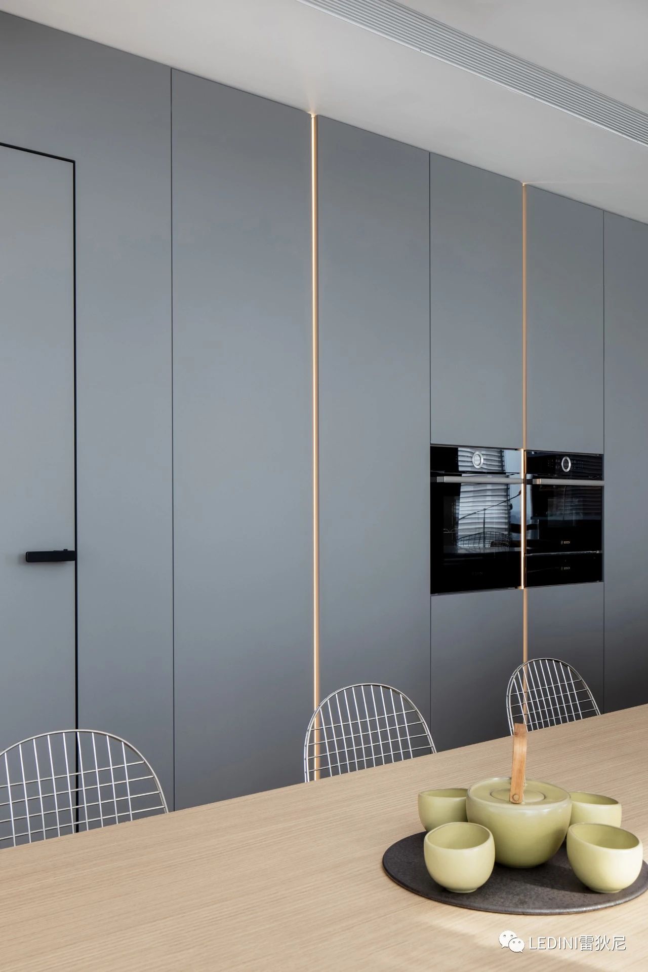 廚房餐廳相互連接,藍(lán)灰色木飾面作為整個(gè)空間中的主要基調(diào),搭配黑色島臺(tái),刻畫(huà)出空間秩序感,