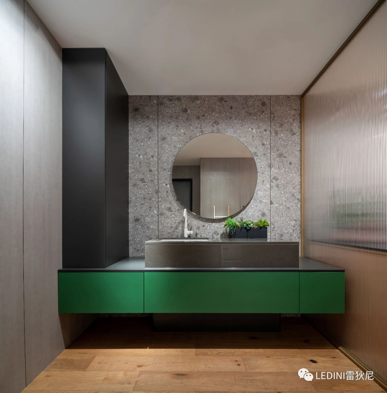 綠與灰的碰撞,不但具有視覺(jué)沖擊力還可以延展空間,濃烈的綠色韻味不至于顯得過(guò)分單調(diào)蒼白,