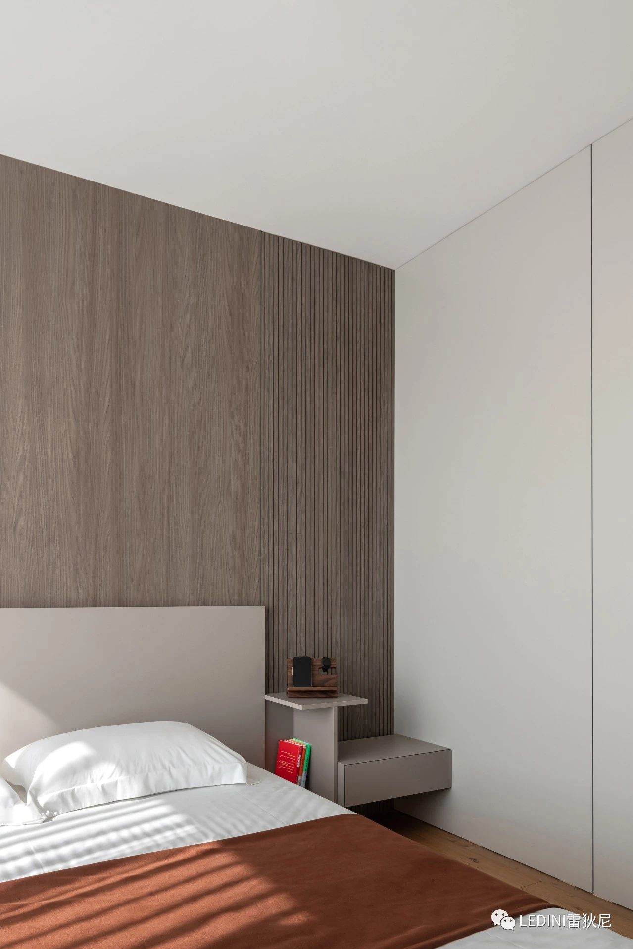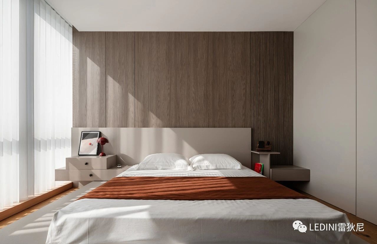 臥室是最放松的空間,設(shè)計(jì)主要以輕奢為基調(diào),咖色木紋背景墻點(diǎn)綴中式氛圍的格柵元素,給人寧?kù)o雅致之感。