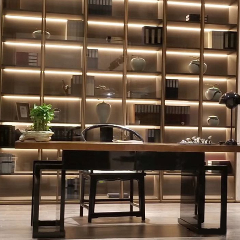 金色系鋁框玻璃書柜搭配暖色燈光點綴,美觀與功能性完美融合;