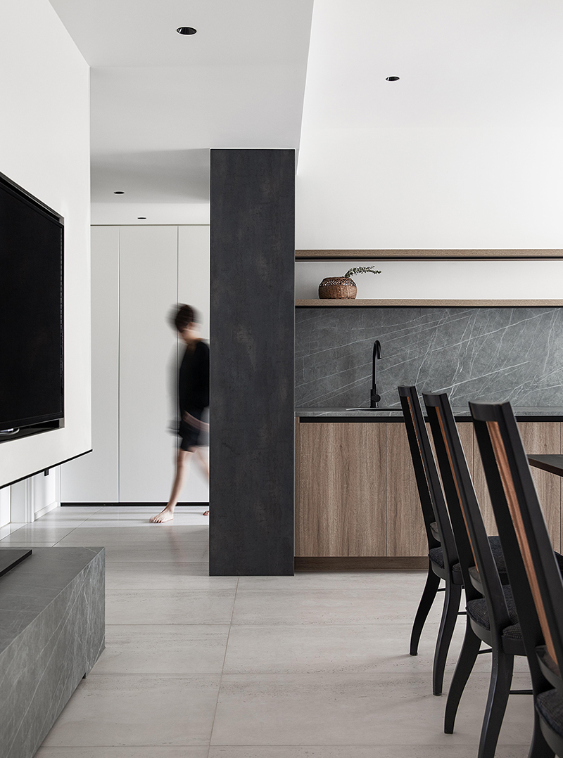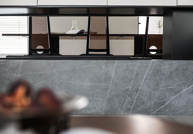 木紋+石紋打造的櫥柜形成“柔”與“硬”的鮮明對比,